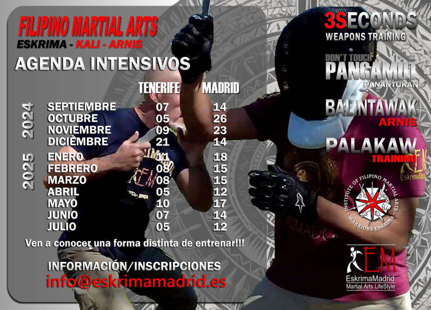 En este programa de formación, aprenderás los fundamentos y contenidos curriculares de los dos sistemas más característicos de nuestra escuela, Warriors Eskrima, Sayoc Kali, 3Seconds. En sesiones intensivas de fin de semana, una por mes, y siempre en sábado, iremos adentrándonos en el material técnico de cada sistema, impartiremos material nuevo, revisaremos el ya explicado y trabajaremos las aplicaciones, escenarios y ejercicios técnicos para desarrollarlo.